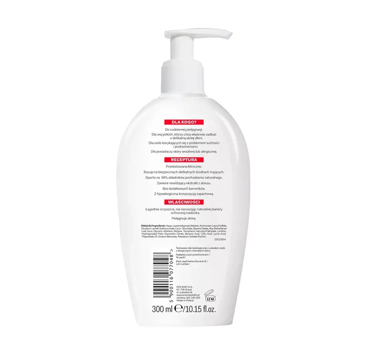 Die AA Flüssigseife wurde dermatologisch an Menschen mit allergischen Hauterkrankungen getestet. Die spezielle Formel des Kosmetikums enthält bis zu 98% Inhaltsstoffe natürlichen Ursprungs. Das Produkt enthält keine Farbstoffe und hat einen hypoallergenen Duft.