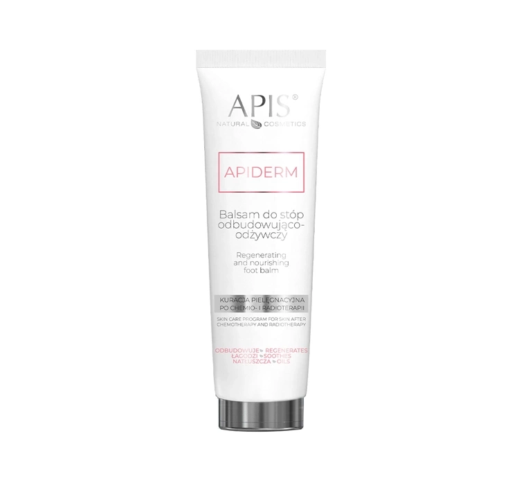 Der regenerierende und nährende Fußbalsam Apis APIDERM wurde auf Basis von pflegenden Ölen: Sonnenblumen-, Lein-, Argan-, Kokosöl, Sheabutter sowie Squalan aus Oliven entwickelt. Der Balsam ist außerdem angereichert mit Inhaltsstoffen wie Hyaluronsäure, Haferextrakt, Aloe, Vitaminen A, E, D-Panthenol und Allantoin. Der regenerierende und nährende Fußbalsam eignet sich für sehr trockene und empfindliche Haut, auch nach chemotherapeutischen und strahlentherapeutischen Behandlungen. Er spendet tiefgehend Feuchtigkeit, nährt und beruhigt Irritationen. Fördert die Regeneration und Erneuerung der Haut. Der Balsam enthält keine Duftstoffe und Farbstoffe.