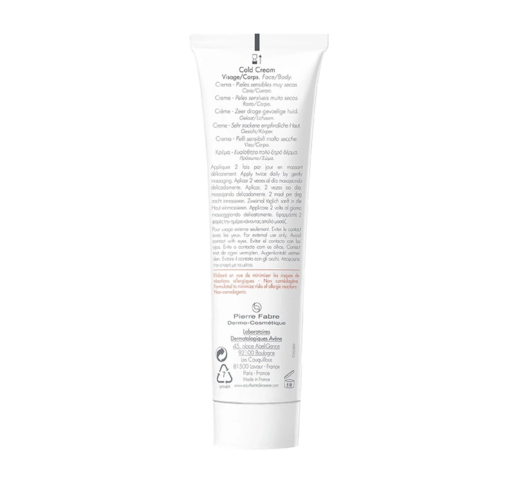 Sie ist extrem reichhaltig und fördert die Erneuerung des Hydrolipidfilms der Haut. Cold Cream ist wasserfest, enthält Bienenwachs, das vor dem Austrocknen und den schädlichen Umwelteinflüssen schützt. Das Kosmetikum enthält auch das Thermalwasser Avene, das die Reizungen lindert und Rötungen kaschiert. Geeignet für die ganze Familie.