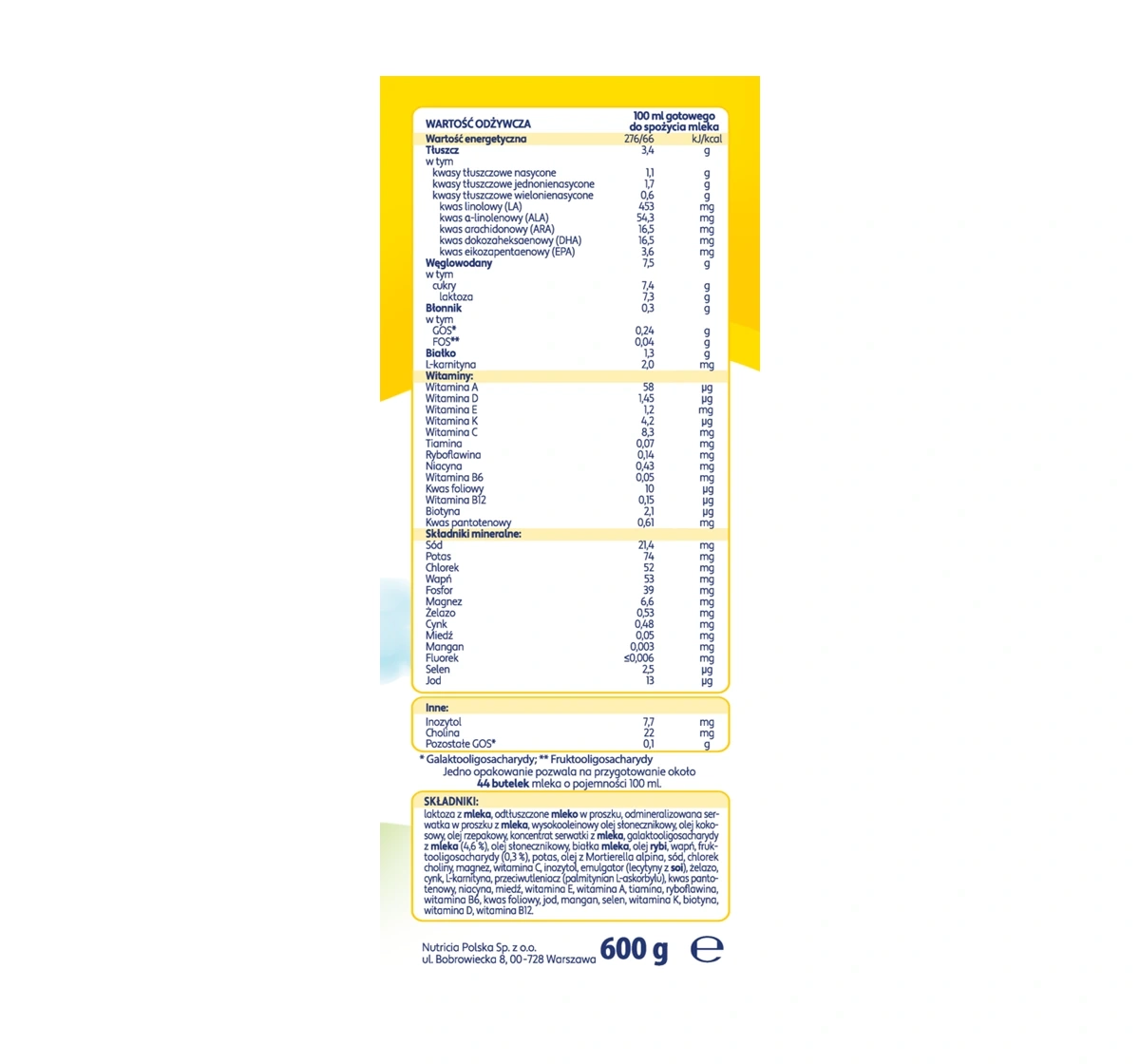 Ingredients: Lactose aus Milch, entrahmtes Milchpulver, demineralisiertes Molkenpulver, hocholeinsäurehaltiges Sonnenblumenöl, Kokosnussöl, Rapsöl, Molkenkonzentrat, Galaktooligosaccharide aus Milch (4,6%), Sonnenblumenöl, Milcheiweiße, Fischöl, Calcium, Fruktooligosaccharide (0,3%), Kalium, Öl aus Mortierella alpina, Natrium, Cholinchlorid, Magnesium, Vitamin C, Inositol, Emulgator (Sojalecithine), Eisen, Zink, L-Carnitin, Antioxidans (Ascorbylpalmitat), Pantothensäure, Niacin, Kupfer, Vitamin E, Vitamin A, Thiamin, Riboflavin, Vitamin B6, Folsäure, Jod, Mangan, Selen, Vitamin K, Biotin, Vitamin D, Vitamin B12