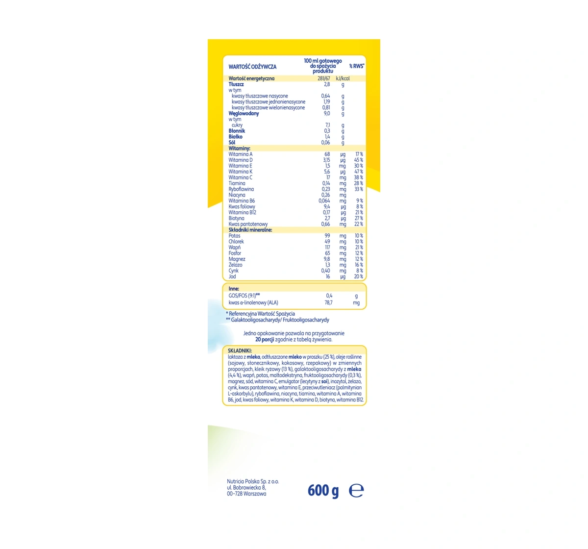 Ingredients: Laktose aus Milch, entrahmtes Milchpulver, Reisbrei (13,6 %), Sonnenblumenöl, Rapsöl, Galaktooligosaccharide aus Milch (4,4 %), hocholeinsäurehaltiges Sonnenblumenöl, Kokosöl, Kalzium, Kalium, Maltodextrin, Fruktooligosaccharide (0,3 %), Magnesium, Natrium, Vitamin C, Inositol, Eisen, Zink, Pantothensäure, Vitamin E, Antioxidationsmittel (Ascorbylpalmitat), Riboflavin, Niacin, Thiamin, Vitamin A, Vitamin D, Vitamin B6, Jod, Folsäure, Vitamin K, Biotin, Vitamin B12.