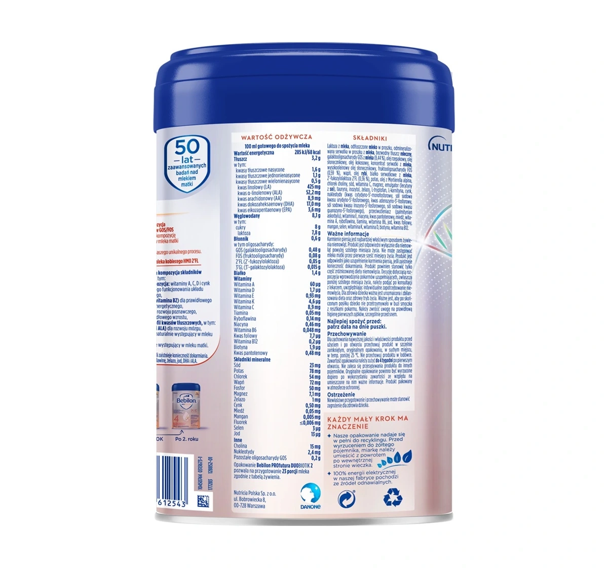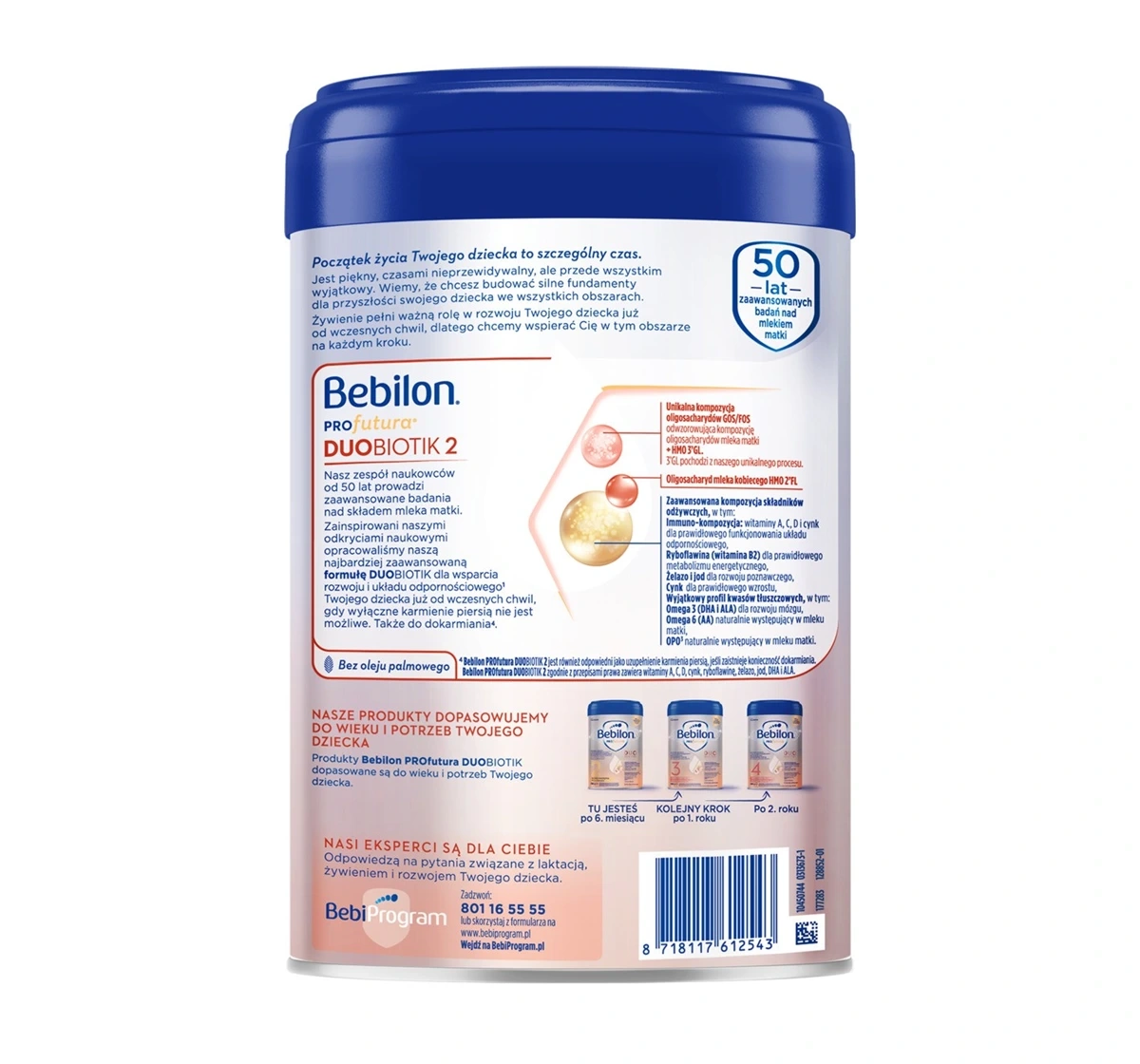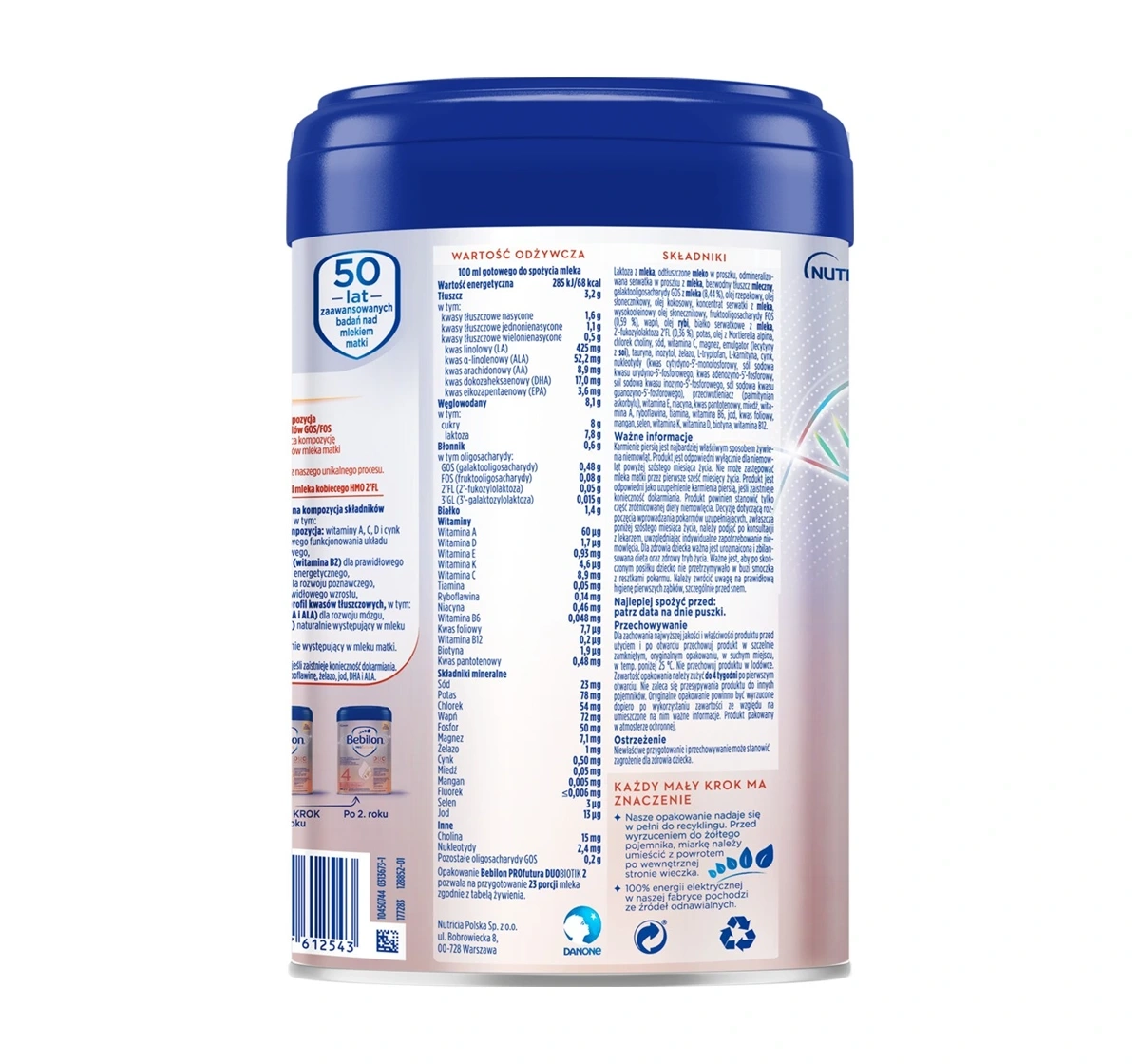 Die innovative Zusammensetzung von Bebilon Profutura Duobiotik 2 enthält einzigartige Oligosaccharide GOS/FOS sowie HMO 3'GL und 2'FL, die die natürlichen Eigenschaften der Muttermilch nachahmen. Das Produkt enthält einen Vitaminkomplex aus A, C und D sowie Zink zur Unterstützung des Immunsystems. Außerdem sind DHA und ALA aus der Omega-3- und Omega-6-Gruppe enthalten, die die Gehirnentwicklung fördern. Milchfett und die Fettstruktur OPO unterstützen zusätzlich die Nährstoffaufnahme, während der Verzicht auf Palmöl einen weiteren Vorteil darstellt.