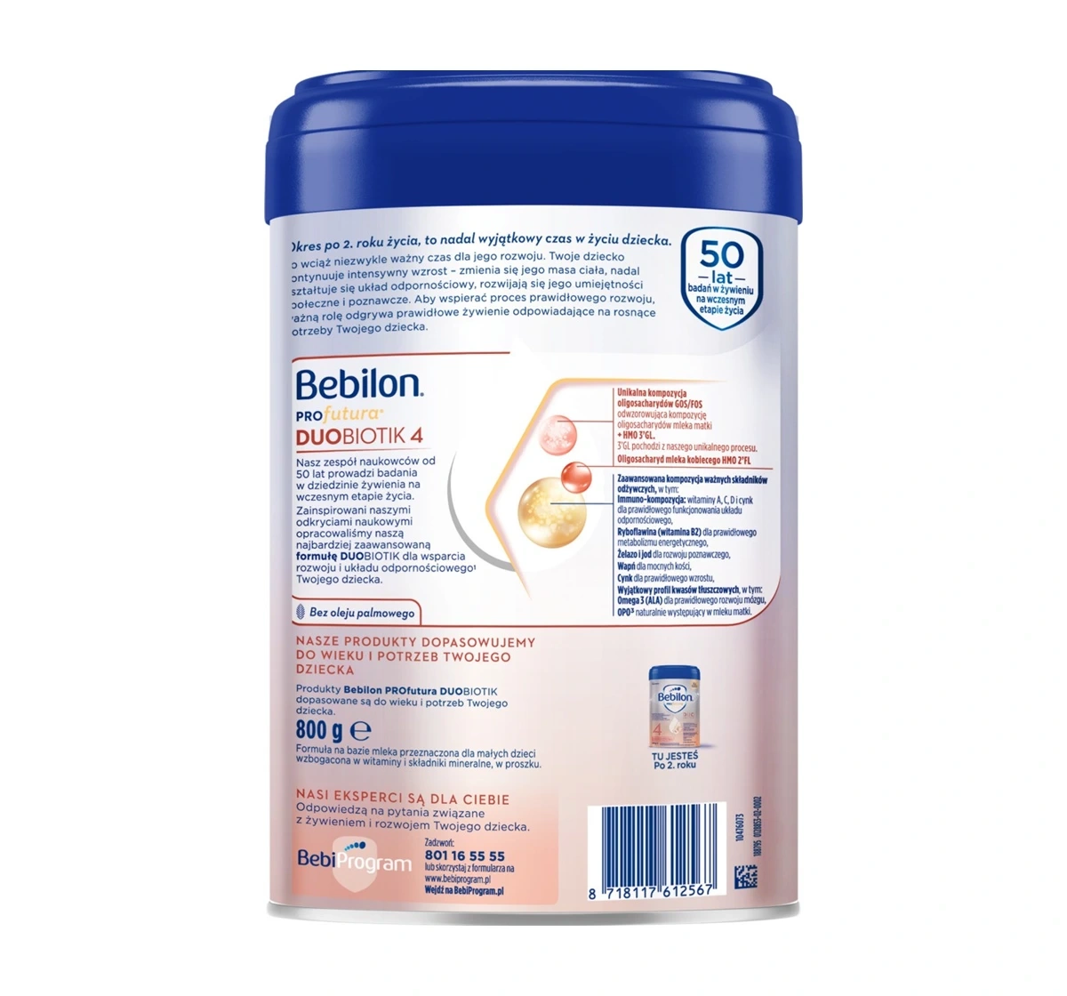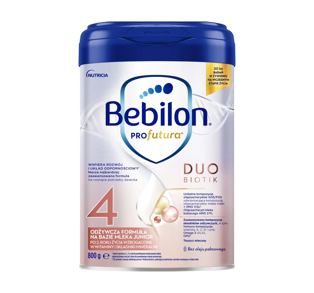 Die Formel Bebilon Profutura DuoBiotik 4 enthält eine einzigartige Kombination von Oligosacchariden GOS/FOS, die die Zusammensetzung der Oligosaccharide der Muttermilch nachahmt, sowie die Oligosaccharide der Muttermilch HMO 2'FL und 3'GL, die aus einem einzigartigen Prozess stammen. Darüber hinaus ist sie mit den Vitaminen A, C, D und Zink angereichert, die die normale Funktion des Immunsystems unterstützen, sowie mit ALA (Omega-3-Fettsäure) für die Gehirnentwicklung. Die Formel enthält kein Palmöl, was sie für bewusste Eltern, die auf eine gesunde Ernährung ihres Kindes achten, geeignet macht.
