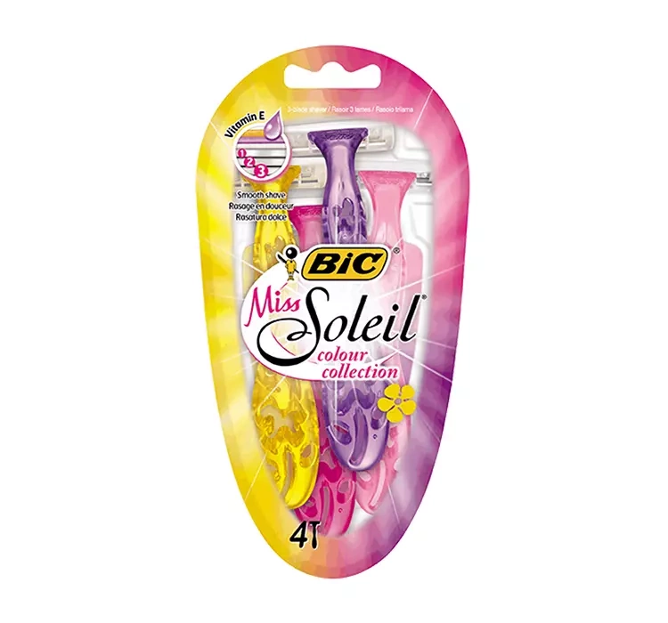 BIC Miss Soleil Colour Collection ist ein Set von bunten Einwegrasierern für Frauen, die nachweislich unerwünschte Haare an allen Körperstellen schnell und schmerzlos entfernen. Ideal für die Rasur von Beinen, Bikinizone, Achseln oder Unterarmen. Jeder einzelne BIC Miss Soleil Colour Collection Damenrasierer hat einen profilierten Kopf mit drei verchromten Klingen. Er ist entsprechend scharf, präzise und langlebig, so dass Du Dir unter allen Bedingungen und Umständen einer störungsfreien Rasur sicher sein kannst. Ein dickerer Schutz- und Feuchtigkeitsstreifen mit Vitamin E erleichtert definitiv den gesamten Haarentfernungsprozess und sorgt für ein gleitendes, glattes und weiches Ergebnis.