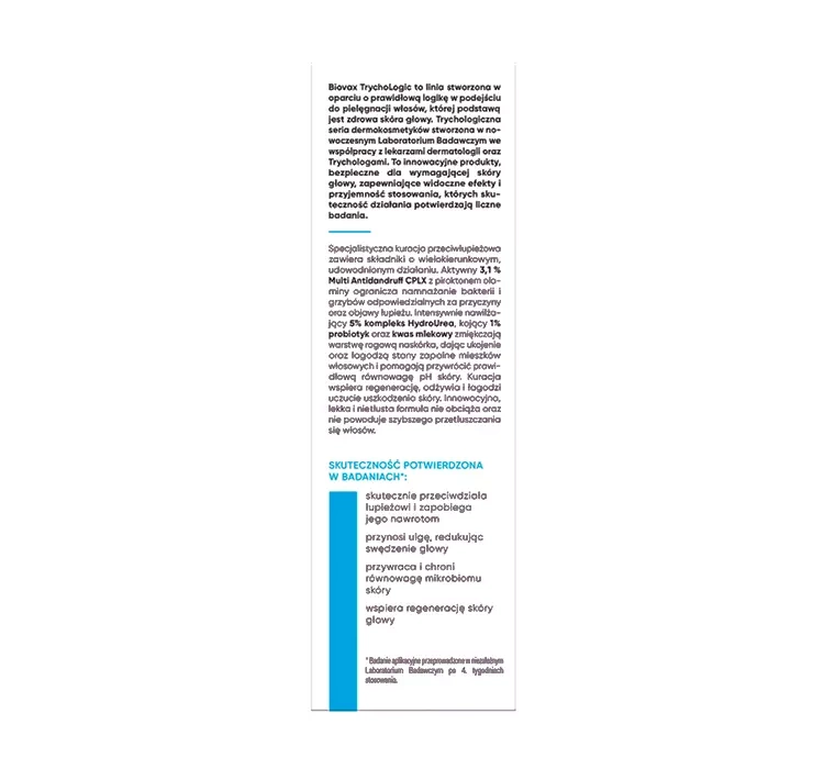 Biovax Trychologic Schuppen ist eine spezialisierte Anti-Schuppen-Behandlung für fettige, schuppende Kopfhaut mit Juckreiz. Die innovative Formel basiert auf dem hochwirksamen Multi Antidandruff CPLX mit Pirocton-Olamin, das die Vermehrung von Bakterien und Pilzen reduziert, die für Schuppen verantwortlich sind. Sofort vermindert es schuppende Stellen und unangenehmen Juckreiz. Die Formel wurde zusätzlich mit HydroUrea-Komplex und Probiotikum angereichert, die tiefenwirksam Feuchtigkeit spenden, Irritationen und Entzündungen der Haarfollikel beruhigen und den pH-Wert der Kopfhaut wiederherstellen. Zudem stärken sie das Mikrobiom und schützen vor schädlichen äußeren Einflüssen.