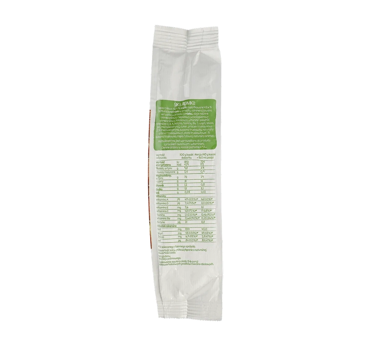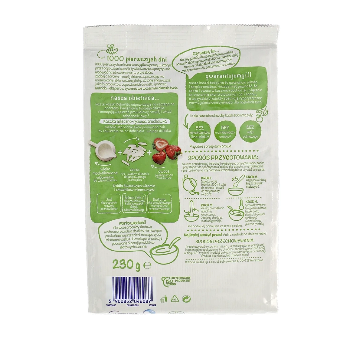 Die Formel des BoboVita Milch-Reisbreis mit Erdbeergeschmack wurde mit Jod angereichert, das die kognitive Entwicklung unterstützt, Eisen und Vitamin C, die für das richtige Funktionieren des Immunsystems notwendig sind, sowie Biotin, das den Energiestoffwechsel fördert.