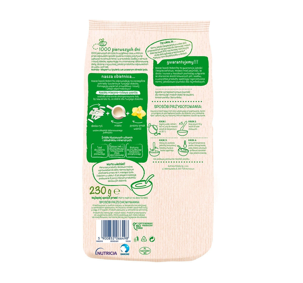 Der BoboVita Milch-Reisbrei mit Vanillegeschmack wird nach den höchsten Qualitäts- und Sicherheitsstandards hergestellt, und die Zutaten wie Getreide und Milch stammen aus sorgfältig kontrollierten Anbauflächen und Zuchtstätten.