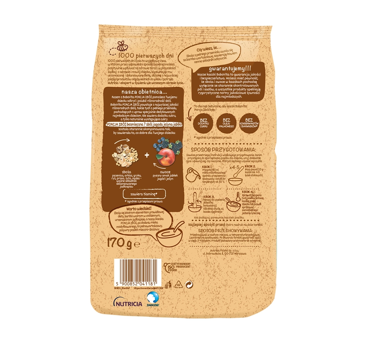 BoboVita Brei ohne Milch 7 Getreide unterstützt eine abwechslungsreiche und ausgewogene Ernährung des Kindes in der intensiven Wachstumsphase, indem sie wertvolle Nährstoffe in einer sanften Form liefert, die für die Kleinsten geeignet ist. Durch die Anwendung der höchsten Qualitätsstandards ist die Kaszka sicher und frei von Konservierungsstoffen, Farbstoffen und Geschmacksverstärkern, gemäß den gesetzlichen Vorschriften.