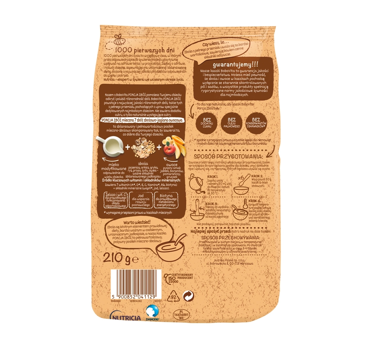 Fruchtiger Milchbrei BoboVita Portion Getreide wurde mit Vitaminen (A, D, E, C, Thiamin, B6, Biotin) und Mineralstoffen (Calcium, Eisen, Jod) angereichert und unterstützt die Entwicklung des Kindes, das Immunsystem und den Energiestoffwechsel.