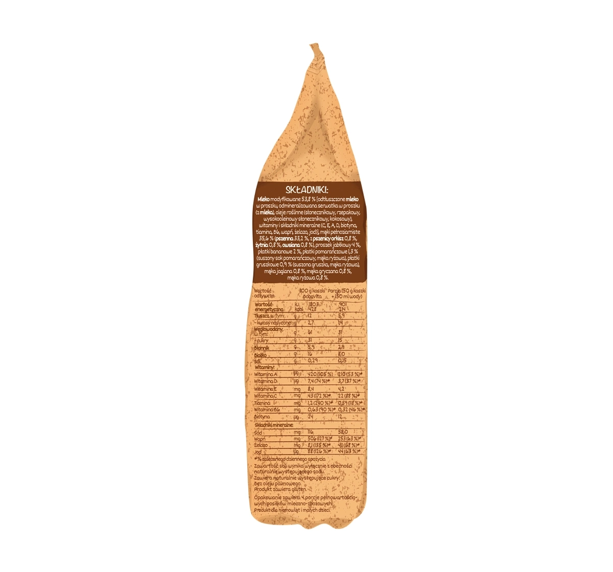Zutaten: Modifizierte Milch 53,8% [Magermilchpulver, entmineralisierte Molkepulver (aus Milch), pflanzliche Öle (Sonnenblumenöl, Rapsöl, hocholeinsäurehaltiges Sonnenblumenöl, Kokosöl), Vitamine und Mineralstoffe (C, E, A, D, Biotin, Thiamin, B6, Calcium, Eisen, Jod)], Vollkornmehle 35,6% (Weizen 33,2%, Dinkelweizen 0,8%, Roggen 0,8%, Hafer 0,8%), Apfelpulver 4%, Bananenflocken 2%, Orangenflocken 1,3% (getrockneter Orangensaft, Reisflour), Hirsemehl 0,8%, Buchweizenmehl 0,8%, Reisflour 0,8%.
