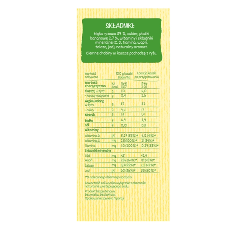 Zutaten: Reismehl 89 %, Zucker, Bananenflocken 2,7 %, Vitamine und Mineralstoffe (C, D, Thiamin, Kalzium, Eisen, Jod), natürlicher Aromastoff.