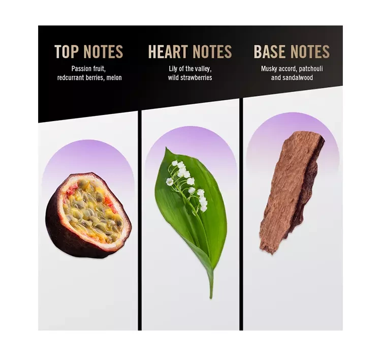 Die Komposition eröffnet mit einer frischen und zugleich eleganten Kombination aus erfrischender Melone, Veilchen, roten Früchten und Passionsblume. Allmählich entwickelt sich der Duft zu einer fruchtig-blumigen, berauschenden Mischung aus süßen Erdbeeren und zarten Maiglöckchen. Sinnlichkeit verleiht der Komposition warmes Sandelholz und pudriger Moschus, die die Basis des Duftes bilden. Die Komposition strahlt einen magischen Charme aus und zieht die Umgebung in ihren Bann. Umhüllt von diesem Duft wirst du hypnotisieren und verführen. Du hinterlässt einen unvergesslichen Eindruck, betonst deine Attraktivität und dein Selbstbewusstsein. Der provokante und sinnliche Duft sorgt dafür, dass kein Mann dir gleichgültig gegenübersteht.