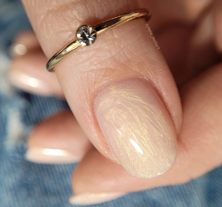 Claresa Soft&Easy Dancing Sparkles Aufbaugel ist ein helles Beige mit subtilen goldenen Glitzerpartikeln, das den Nägeln einen eleganten, dezenten Effekt verleiht. Ideal als eigenständige Maniküre für einen schönen, subtilen Seashell-Look. Dank der hoch deckenden Formel – bis zu 90 % – entsteht eine glatte, gleichmäßige und langlebige Nageloberfläche.