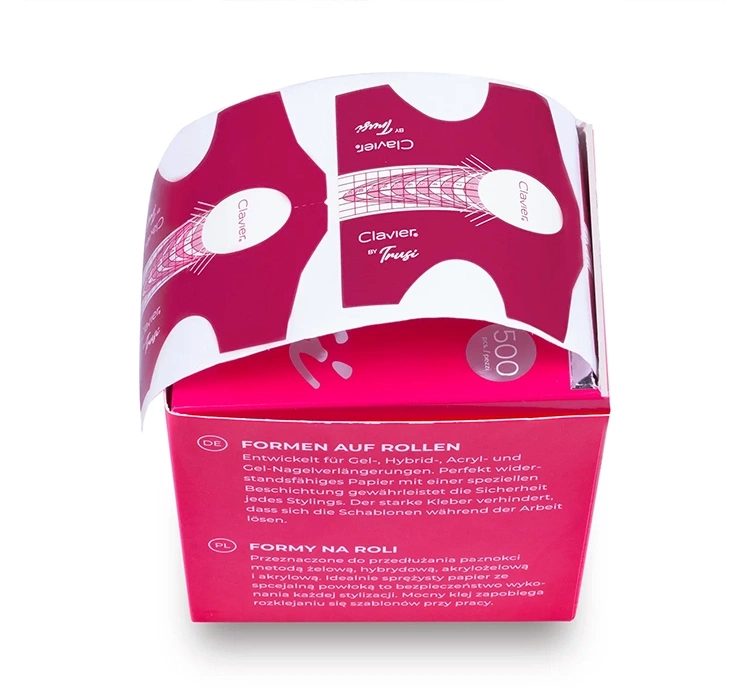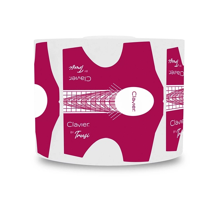 Die Clavier by Trusi Nagelverlängerungsschablonen auf Rolle sind in einer Packung mit 500 Stück erhältlich. Diese Schablonen zeichnen sich durch ihre außergewöhnliche Klebekraft und spezielle Struktur aus, die eine perfekte Haftung auf der Haut der Finger gewährleistet. Dies garantiert nicht nur eine präzise, sondern auch eine dauerhafte Aushärtung, die für einen lang anhaltenden Styling-Effekt entscheidend ist.
