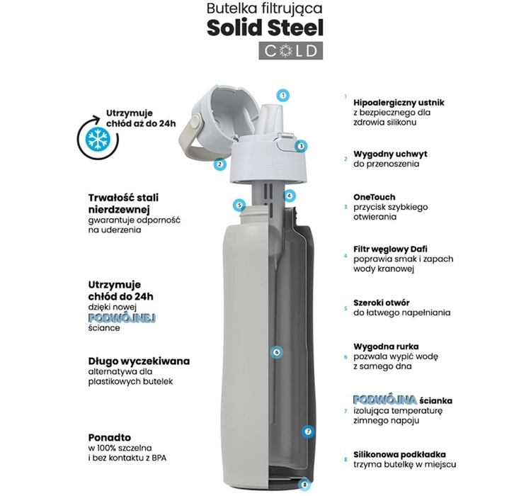 Die Filterflasche Dafi Solid Steel Cold wurde für aktive Menschen mit gesundheitsbewusstem Lebensstil entwickelt. Dank der kompakten Form passt sie problemlos in den Fahrradhalter oder die Sporttasche, und der stabile Griff erleichtert das Tragen. Eine ideale Wahl für alle, die den Verbrauch von Einwegverpackungen reduzieren und gleichzeitig Geld sparen möchten.