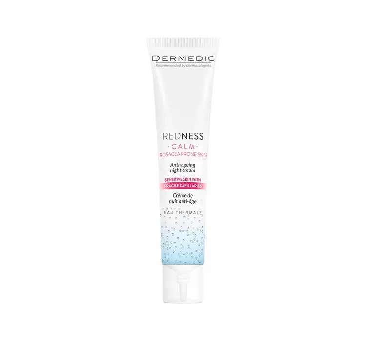 Die Dermedic Redness Calm Anti-Falten-Nachtcreme ist eine einzigartige Kosmetik, die tiefe Feuchtigkeit spendet, nährt, die Regeneration anregt und empfindliche Gefäßhaut effektiv pflegt. Die innovative Formel des Kosmetikums lindert Irritationen und Rötungen und verbessert so den Zustand und das Aussehen. Der enthaltene Rosashield-Komplex ergänzt den Mangel an Vitaminen und Spurenelementen, wodurch die Haut ihr Gleichgewicht wiedererlangt und weniger anfällig für den negativen Einfluss äußerer Faktoren oder oxidativen Stress ist, der für eine schnellere Alterung verantwortlich ist. Zudem reduziert das Kosmetikum Schwellungen, das Spannungsgefühl und die Ausdehnungsneigung der Blutgefäße. Eine nicht komedogene, hypoallergene Kosmetik mit Thermalwasser.