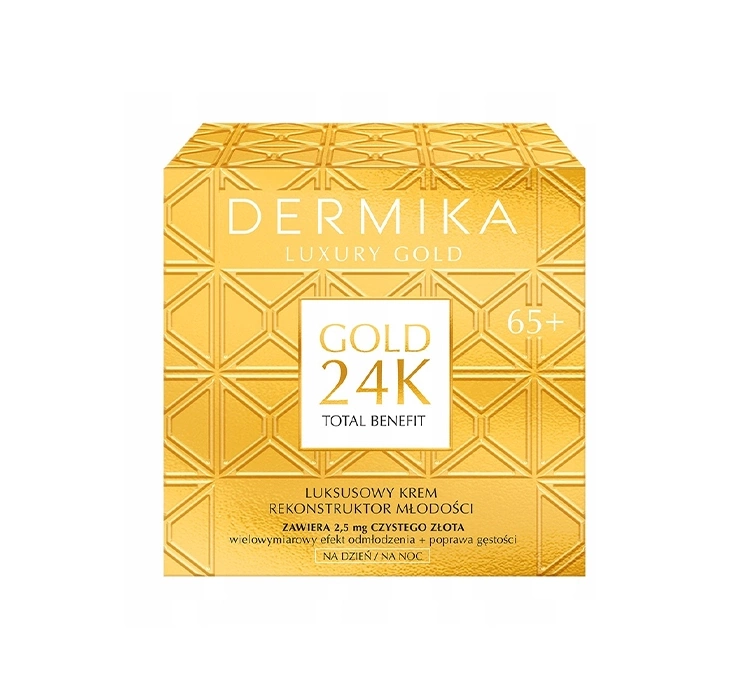 Dermika Luxury Gold 24K Total Benefit Gesichtscreme Jugend-Rekonstruktor 65+ ist eine umfassende Pflegekur, die das Hautbild intensiv verjüngt. Die mit 24-karätigem Gold und patentierten Total Benefit-Technologien angereicherte Formel bietet multidimensionale Wirkung und geht gezielt auf die Bedürfnisse reifer Haut ein. Die Dermika Gold 24K Creme wirkt gegen tiefe Falten und verbessert die Hautfestigkeit und Elastizität.