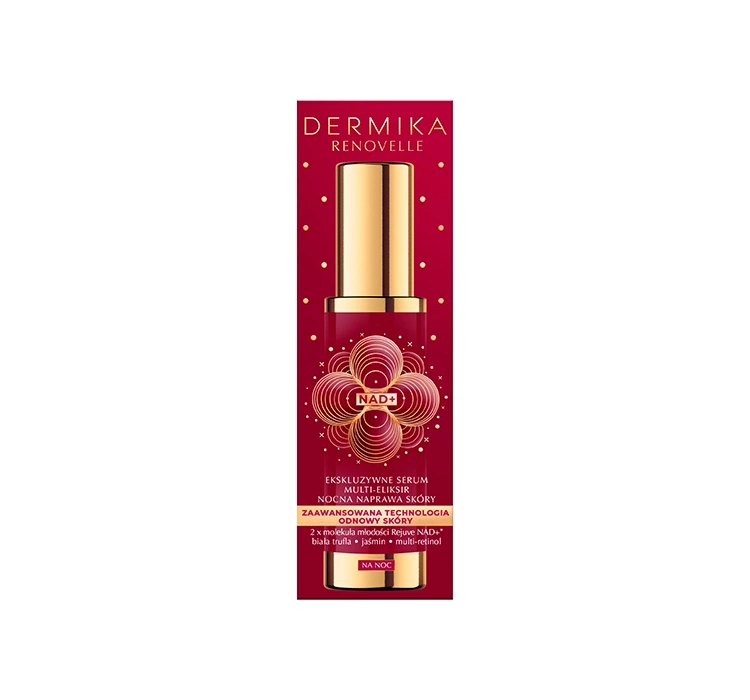 Exklusives Serum – Multi-Elixier Nachtregeneration der Haut Dermika Renovelle ist eine intensive, luxuriöse Nachtpflege, entwickelt für reife Haut, die Regeneration, Glättung und Verjüngung benötigt. Dieses Produkt wirkt in der Nacht, wenn die Haut die aktiven Inhaltsstoffe am besten aufnimmt und die natürlichen Reparaturprozesse am aktivsten sind. Die cremige, umhüllende Textur sorgt für ein angenehmes Auftragen und lässt die Haut „ausruhen“ – mit nährender Unterstützung, die ihr bis zum Morgen Glanz und Strahlkraft zurückgibt.