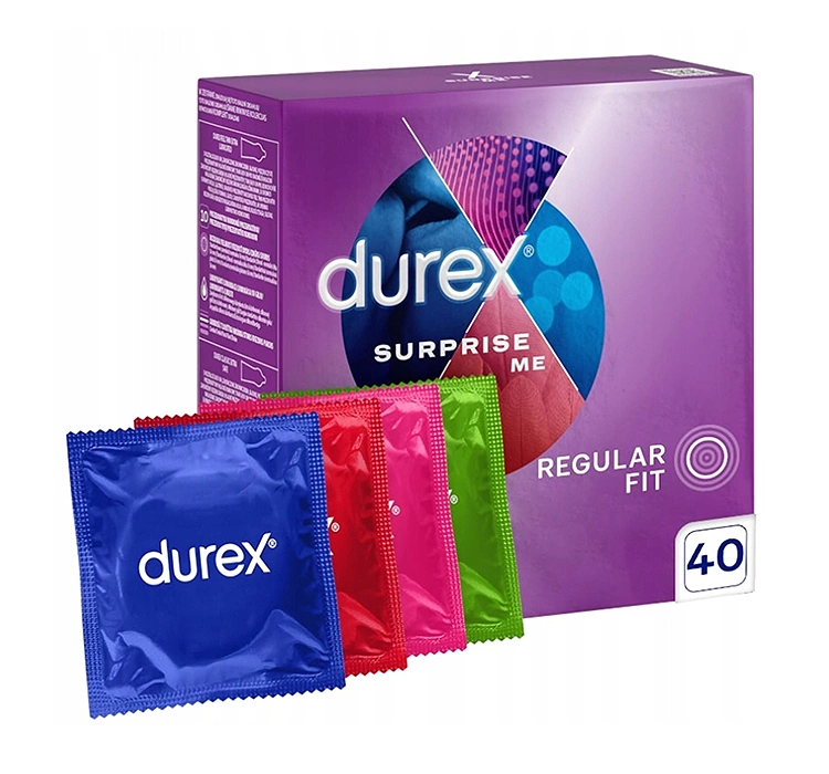 Durex Suprise Me Variety ist eine große Packung mit 4 Arten von Kondomen - 10x Feel Thin, 10x Pleasuremax, 10x Extra Safe, 10x Arouser. Durex Feel Thin sind ultradünn mit einer zusätzlichen Menge an Gleitmittel, Pleasure Max haben konvexe Streifen und eine zusätzliche Menge Gleitmittel, Extra Safe sind dicker und mit einer zusätzlichen Menge Gleitmittel, während Arouser gerippt sind.