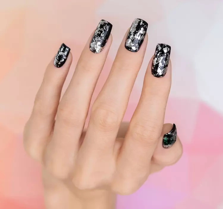Die Folie Drama? Nah! besteht aus dünnen, metallischen Flocken, die jedes Nageldesign in ein Kunstwerk verwandeln können. Ob klassisch oder auffällig – mit der Folie kannst du jedem Look eine persönliche Note verleihen. Verwende sie für unregelmäßige Formen, als Füllung beim French Manicure oder als Highlight in der Mitte oder am Rand des Nagels.