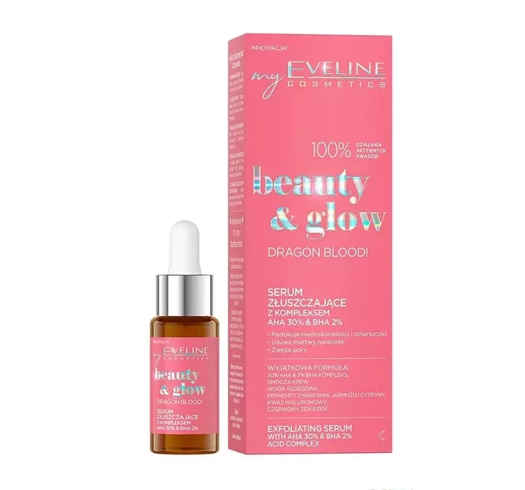 Das Beauty & Glow Eveline Peeling-Serum mit dem AHA 30% und BHA 2% Dragon Blood!-Komplex ist ein Element der Abendpflege, das deiner Haut ihr jugendliches Aussehen zurückgibt. Es ist perfekt auf die Bedürfnisse von fettiger, gemischter und stumpfer Haut abgestimmt. Es wird auch Menschen erleichtern, die mit Verfärbungen, Unvollkommenheiten und sichtbaren Falten zu kämpfen haben. Seine innovative Formel beinhaltet das namensgebende Drachenblut, roten Ginseng sowie natürliche Fermente aus Karotten, Grünkohl und Zitrone. Die Kraft natürlicher Inhaltsstoffe wird sich mit deiner Haut anfreunden, ohne ihre Poren zu verstopfen.
