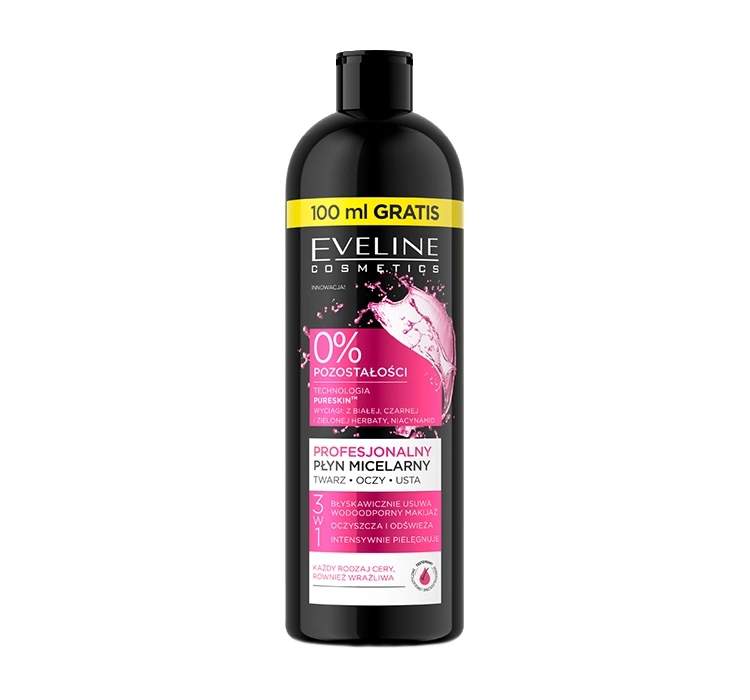 Professionelles 3in1 Mizellenwasser Eveline ist eine vielseitige Lösung zur täglichen Gesichtsreinigung, geeignet für alle Hauttypen, auch empfindliche Haut. Dank der innovativen PureSkin™-Technologie entfernt das Produkt Make-up, einschließlich wasserfestem Make-up, und alle Unreinheiten, ohne das natürliche Gleichgewicht der Haut zu stören.