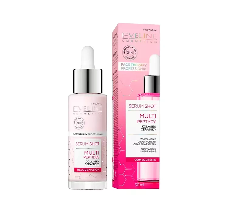 Das Multipeptide Serum aus der Eveline Serum Shot Serie wurde speziell für die Pflege reifer, normaler, trockener und dehydrierter Haut entwickelt. Die reichhaltige Formel des Kosmetikprodukts basiert auf der wertvollen Wirkung von 12 Peptiden, die die Haut intensiv pflegen und zu einer schnelleren Regeneration anregen. Darüber hinaus befeuchten sie es intensiv und stellen so seinen verlorenen Komfort wieder her. Die Zusammensetzung wurde außerdem mit Kollagen angereichert, das die Dichte und Elastizität der Haut verbessert, und Ceramiden, die die Schutzbarriere stärken und Falten und feine Linien sichtbar glätten. Die praktische Verpackung mit einer Pipette ermöglicht eine schnelle, einfache und hygienische Anwendung des Produkts.