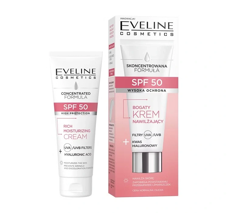 Die reichhaltige Feuchtigkeitspflegecreme mit SPF50 von Eveline ist ein veganer, dermatologisch getesteter Artikel, der fortschrittlichen Sonnenschutz mit intensiver Pflege kombiniert und der Haut täglich Schutz, Feuchtigkeit und einen strahlenden Teint bietet.
