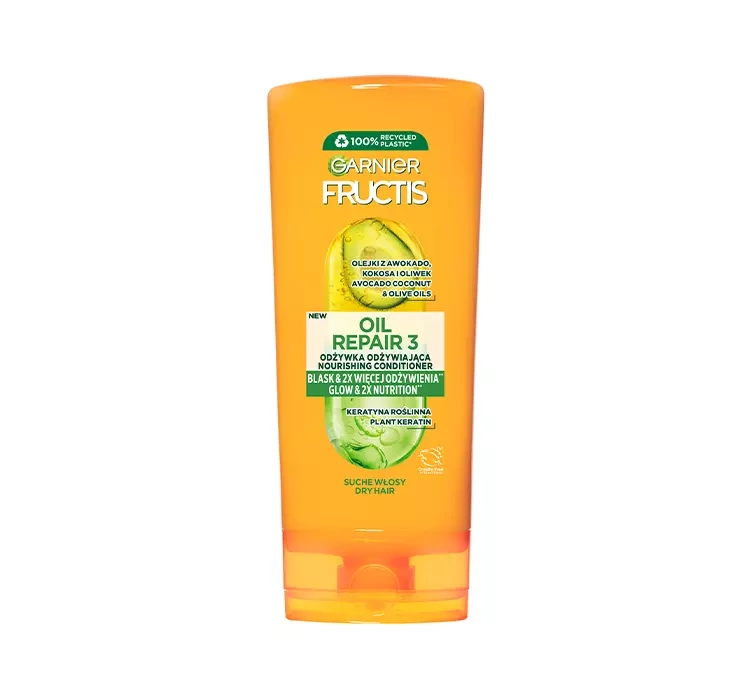 Die Spülung Fructis Oil Repair 3 tun Ihr Haar ernährt, weich und glänzend! Ihre Formel enthält 3 ernährende Öle aus Oliven, Avocado und Karite, sowie Kokosölextrakt, damit die Haare ernährt und regeneriert werden.