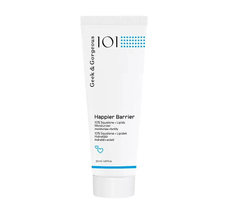 Geek&Gorgeous Happier Barrier ist eine nährende und intensiv feuchtigkeitsspendende Gesichtscreme, die sich perfekt für die tägliche Pflege von trockener, normaler und Mischhaut eignet. Sie ist besonders empfehlenswert für Menschen mit empfindlicher Haut, die zu Irritationen und Trockenheit neigt. Die innovative Formel des Kosmetikums enthält eine äußerst effektive Kombination von Wirkstoffen, die sich positiv auf das Aussehen und den Zustand der Haut auswirken. Wertvolles Squalan verbessert den Feuchtigkeitsgehalt der Haut und beugt übermäßiger Trockenheit vor. Eine Lipidmischung mit Jojoba-, Macadamia- und Olivenöl hilft, die natürliche Schutzbarriere zu reparieren, die Epidermis zu befeuchten und zu glätten, während Grüntee-Extrakt starke antioxidative, entzündungshemmende und beruhigende Eigenschaften aufweist. Die Komposition ist außerdem mit Bisabolol und Allantoin angereichert, die die Haut zur schnelleren Regeneration anregen und Reizungen lindern.