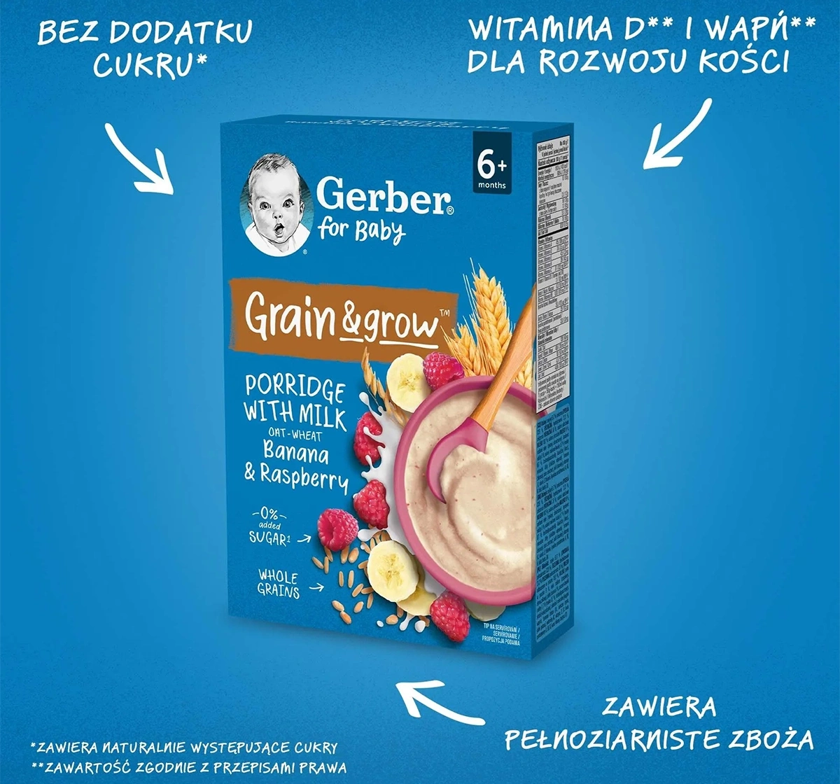 Gerber Grain & Grow Milch-Getreidebrei aus Hafer und Weizen für Säuglinge ab dem 6. Monat enthält keinen zugesetzten Zucker – die Süße stammt ausschließlich aus natürlich vorkommenden Zuckern in Früchten und Milch. Eine ideale Möglichkeit, die Ernährung des Babys zu bereichern und von Anfang an gesunde Essgewohnheiten zu fördern.