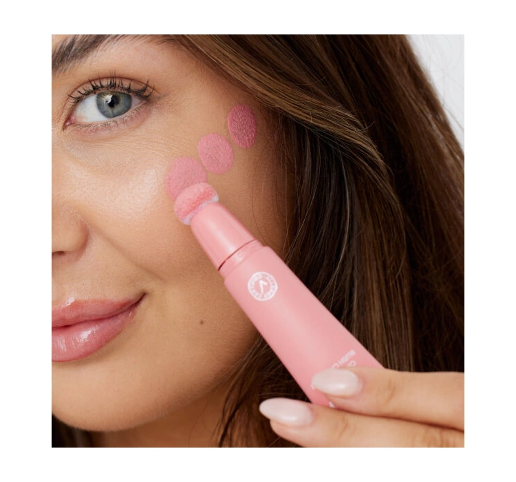Schritt 2. Drücken Sie leicht auf die Tube, bis eine kleine Menge Produkt aus dem Schwämmchen herauskommt. Tragen Sie kleine Punkte des Creme-Rouges mit dem Applikator auf die Wangenknochen auf und verblenden Sie sie mit einem Schwämmchen, Pinsel oder den Fingerspitzen.