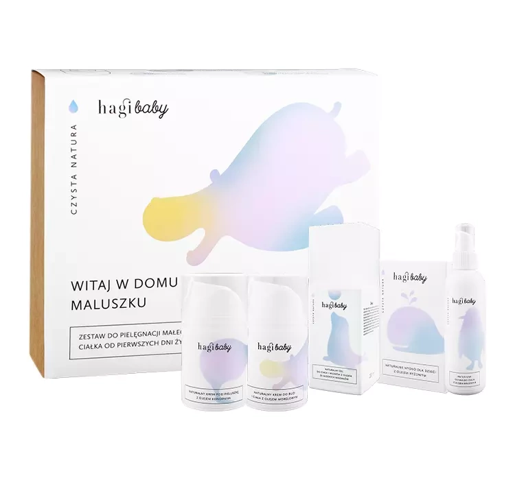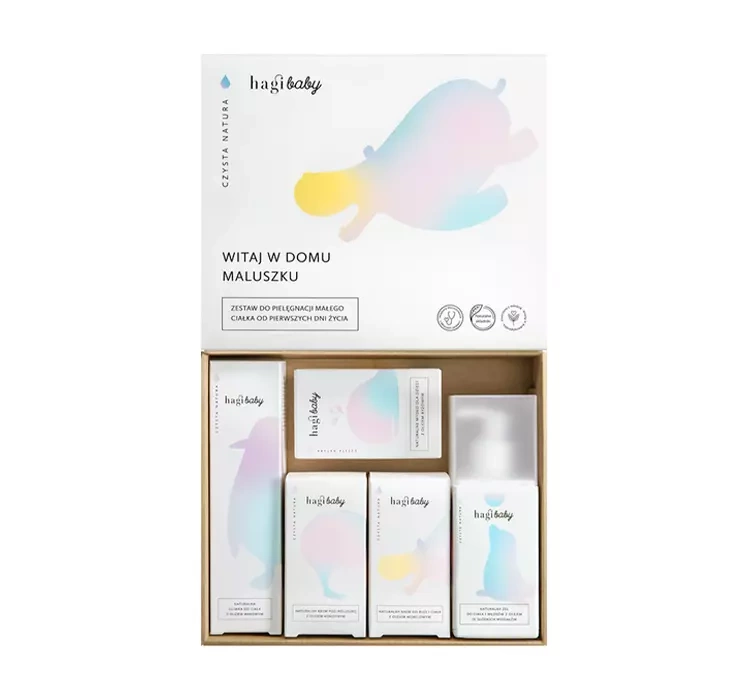 Das natürliche Pflegeset für Kinder ab dem 1. Lebenstag Hagi Baby ist in einer eleganten, ästhetisch gestalteten und dekorierten Schachtel verpackt, die du als Geschenkset behandeln und jungen Eltern überreichen kannst. Sieh dir die ganze Serie Hagi Baby an, wo du die einzelnen Produkte aus dem Set finden kannst.