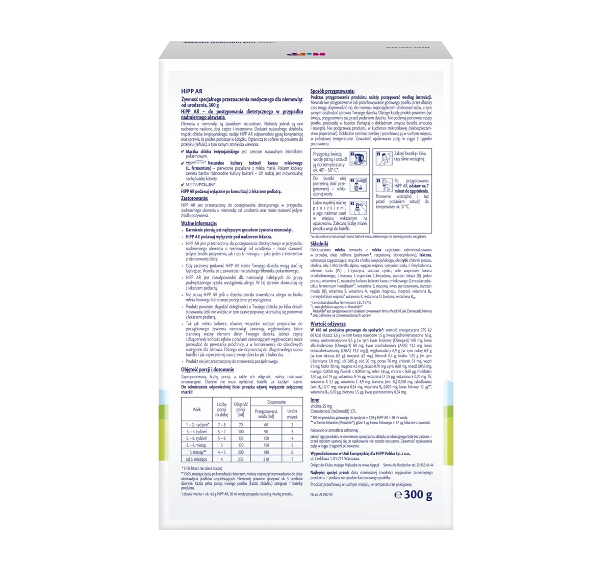 - Stillen ist die beste Ernährung für Säuglinge. - Geben Sie HiPP AR nur unter ärztlicher Aufsicht. - HiPP AR ist zur diätetischen Behandlung von Säuglingen mit übermäßigem Spucken vorgesehen. Es ist geeignet für Säuglinge ab der Geburt – als ausschließliche Nahrung sowie ab dem 6. Monat – als Teil einer ausgewogenen Ernährung. HiPP AR ist nicht geeignet für Säuglinge, die ein erhöhtes Risiko für Allergien haben. Konsultieren Sie in diesem Fall einen Kinderarzt. Verwenden Sie HiPP AR nicht, wenn bei Ihrem Kind eine Kuhmilchproteinallergie diagnostiziert wurde oder der Verdacht auf eine solche besteht. - Das Produkt sollte die Beschwerden Ihres Kindes nach einigen Tagen der Anwendung lindern. Wenn innerhalb dieser Zeit keine Verbesserung zu sehen ist, wenden Sie sich erneut an den Kinderarzt. - Achten Sie auf die Hygiene der ersten Zähne Ihres Kindes, lassen Sie es nicht zu, dass das Kind die Flasche mit dem Produkt über einen längeren Zeitraum saugt, und gewöhnen Sie es so früh wie möglich daran, aus einem Becher zu trinken. - Das Produkt ist nicht zur parenteralen Anwendung bestimmt.