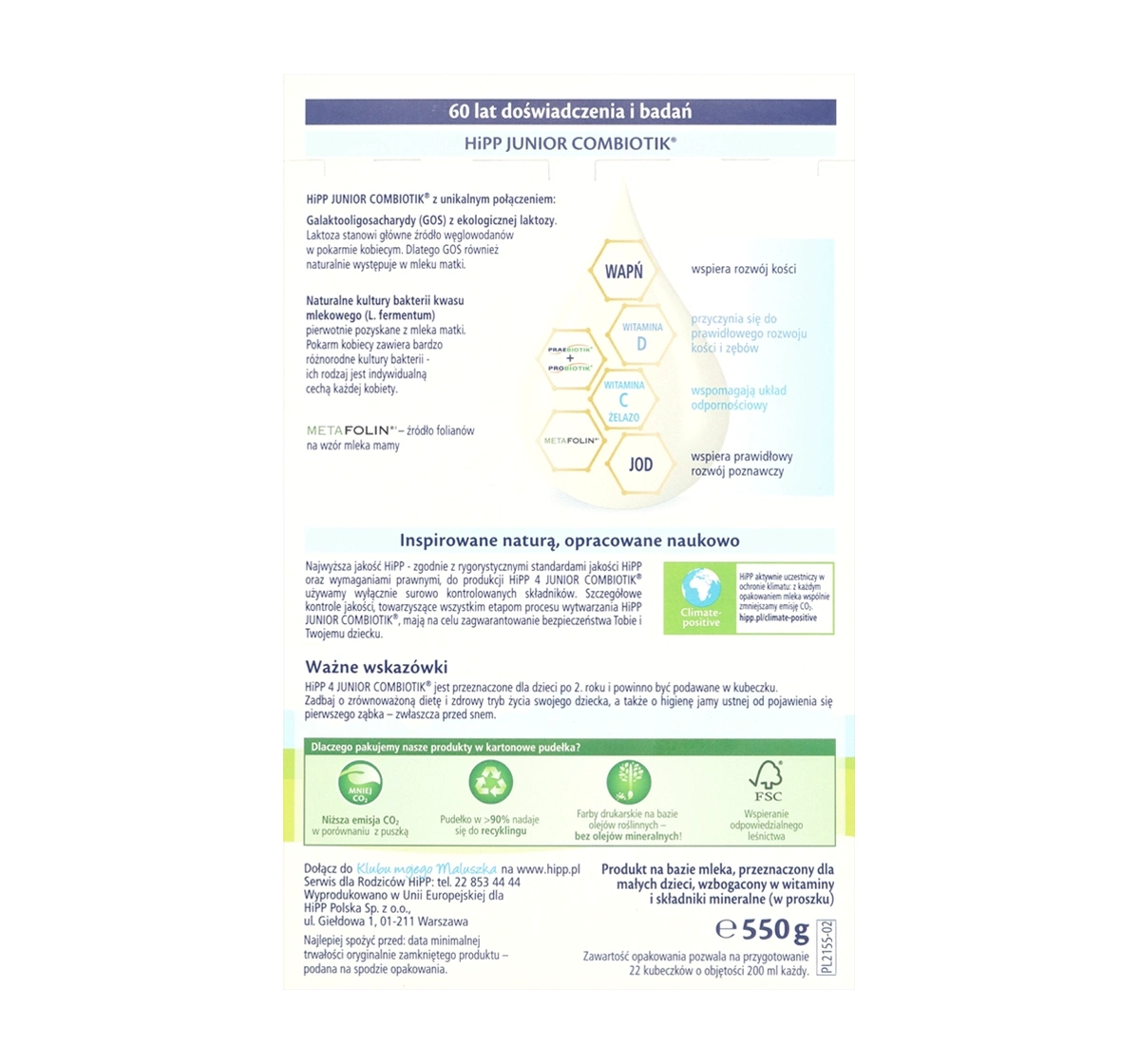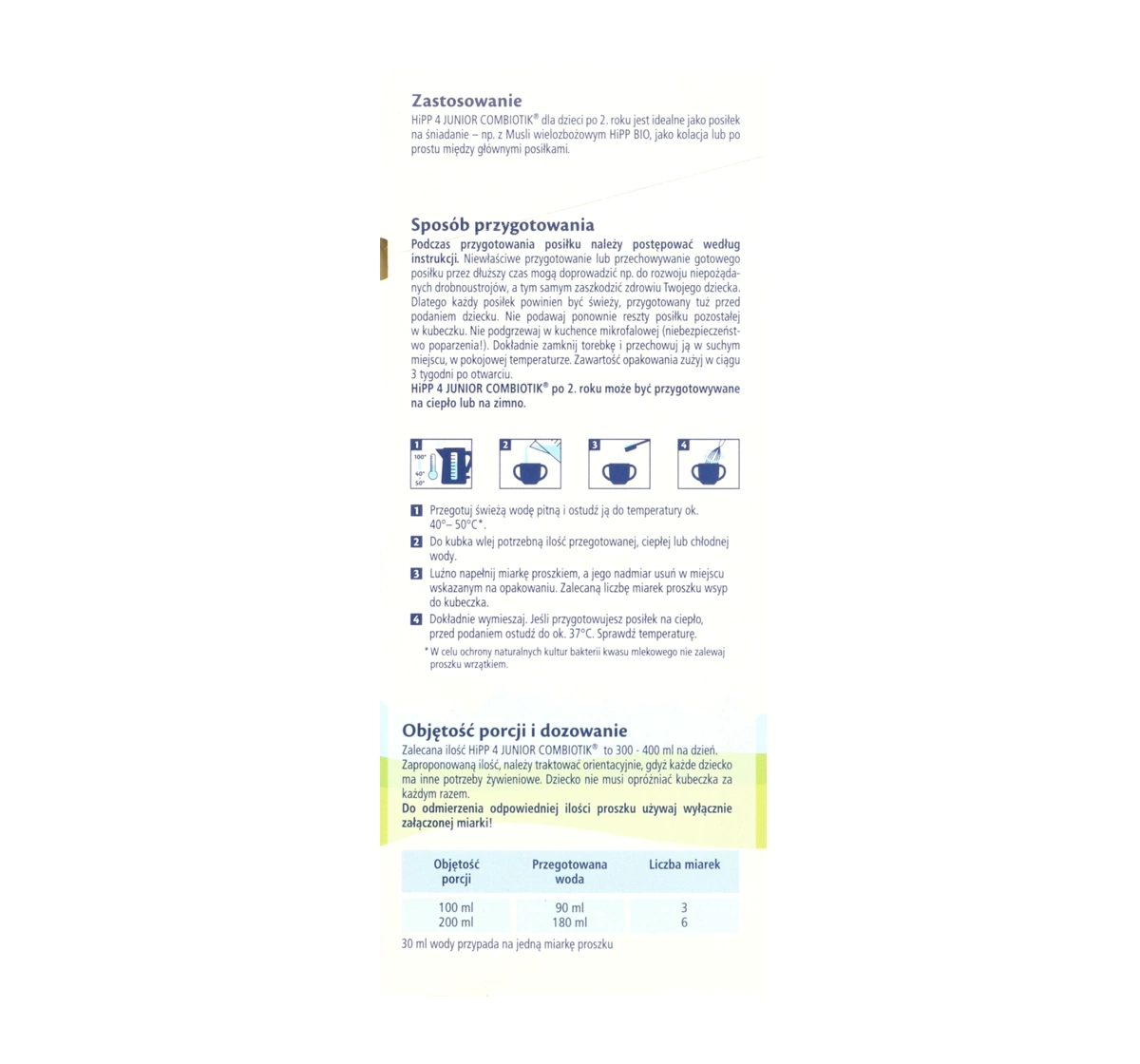 • Denken Sie daran, dass HiPP 4 Junior Combiotik für Kinder ab dem 2. Lebensjahr bestimmt ist und in einer Tasse serviert werden sollte. Achten Sie auf eine ausgewogene Ernährung und einen gesunden Lebensstil Ihres Kindes.
