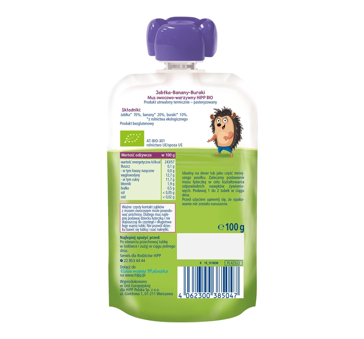 WARNHINWEISE: Zur Sicherheit: Vor dem Gebrauch prüfen, ob die Verpackung unbeschädigt ist. Das Kind nicht mit dem Beutel oder dem Deckel spielen lassen. Wichtig: Häufiger Kontakt der Zähne mit dem Püree kann Karies verursachen. Daher das Püree vorzugsweise mit dem Löffel füttern und längeres Saugen am Beutel vermeiden.