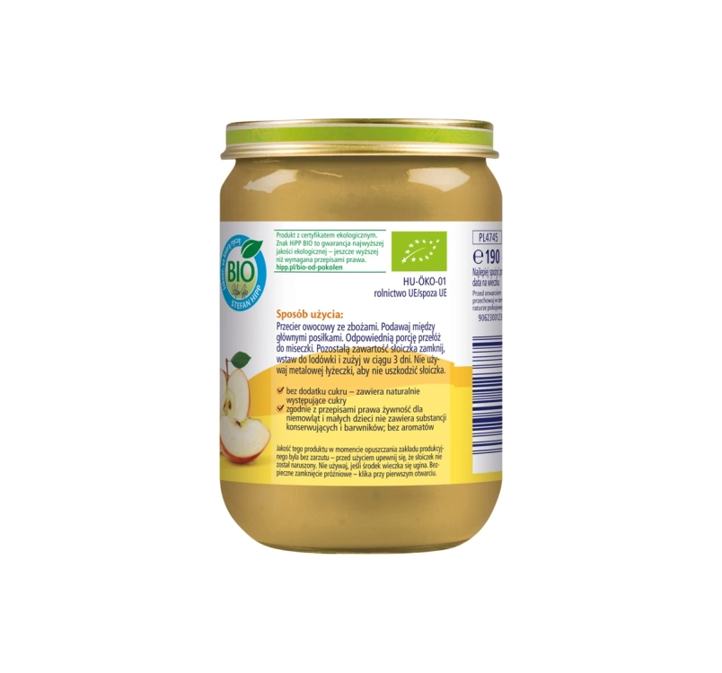 Im HiPP BIO Dessert werden ausschließlich Früchte aus kontrolliert biologischem Anbau wie Äpfel, Bananen oder Birnen verwendet, ergänzt durch Getreideprodukte. Die Rezeptur enthält keinen zugesetzten Zucker – die Süße stammt ausschließlich aus natürlichen Zutaten. Das HiPP Frucht-Getreide-Dessert ist frei von Konservierungsstoffen, Farbstoffen und Aromazusätzen. Die sanfte Rezeptur erfüllt höchste Standards der Säuglingsernährung gemäß den BIO-Richtlinien.