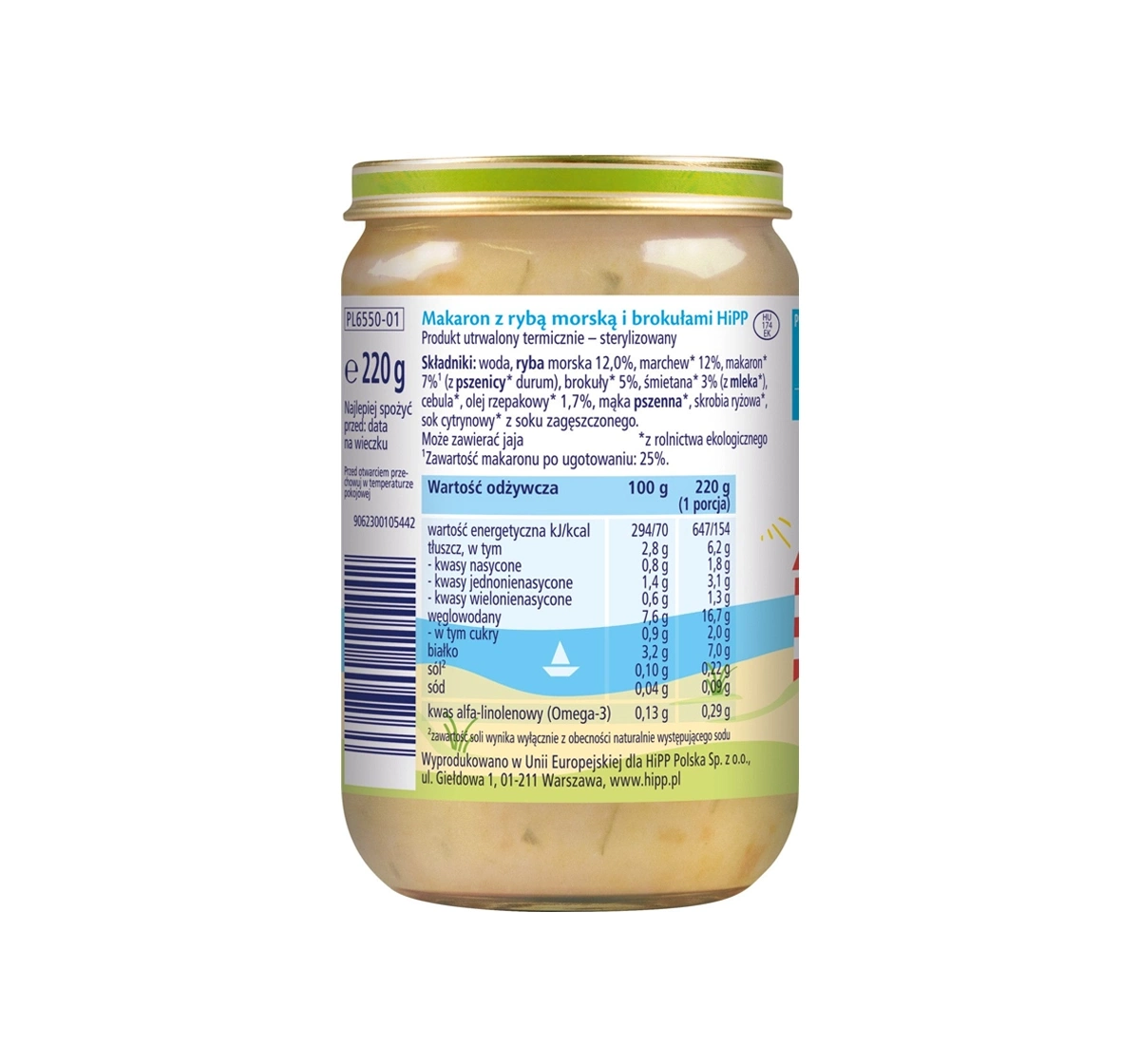Zutaten: Wasser, Meeresfisch 12,0 %, Karotten* 12 %, Pasta* 7 %** (aus Hartweizengrieß*), Brokkoli* 5 %, Sahne* 3 % (aus Milch*), Zwiebeln*, Rapsöl* 1,7 %, Weizenmehl*, Reisstärke*, Zitronensaft* aus Zitronensaftkonzentrat.