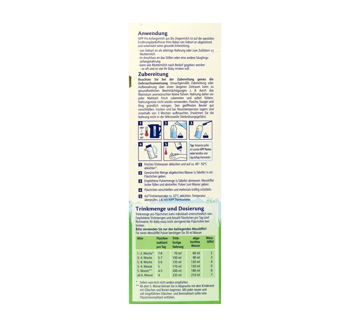 HiPP Bio Ziegenmilchnahrung 1 ist für Babys ab der Geburt geeignet, sowohl als alleinige Nahrung als auch zur Ergänzung des Stillens. Sie kann nach Beendigung des Stillens oder als Ersatz für eine andere Säuglingsnahrung verwendet werden.