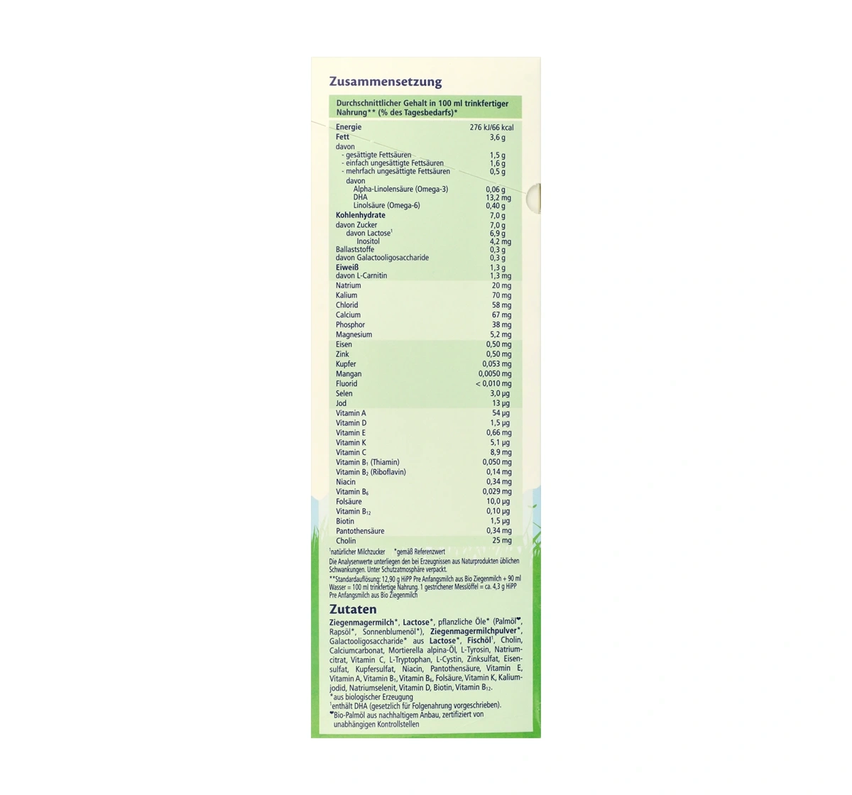 Ingredients: Magermilch, Lactose, pflanzliche Öle (Palmöl*, Rapsöl, Sonnenblumenöl), Galaktooligosaccharide aus Lactose, Kaliumcitrat, Calciumcitrat, Phosphat-Ca, Fischöl, Zinksulfat, Vitamin C, Eisen(II)-sulfat, Kaliumjodid, Biotin, natürliche Milchsäurebakterienkulturen (Limosilactobacillus fermentum hereditum3), Vitamin B2, Vitamin A, Calcium-Methylfolat2, Vitamin D, Vitamin B12