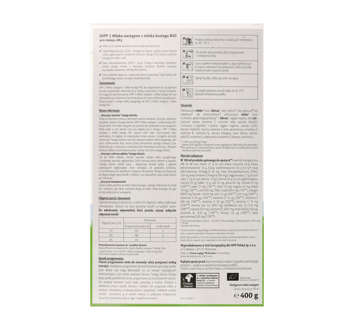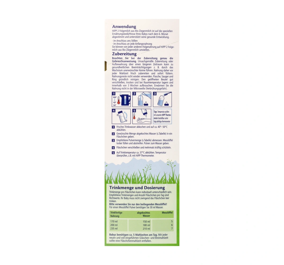 Bei der Zubereitung der HiPP Bio 2 Folgemilch aus Ziegenmilch sollten die folgenden Anweisungen beachtet werden, um Sicherheit und die richtige Qualität der Mahlzeit für das Kind zu gewährleisten. Die empfohlene Portionsgröße und -menge sind ungefähr, und das Kind muss nicht die Flasche jedes Mal leer trinken. Verwenden Sie nur den beigefügten Messlöffel zum Abmessen des Pulvers.