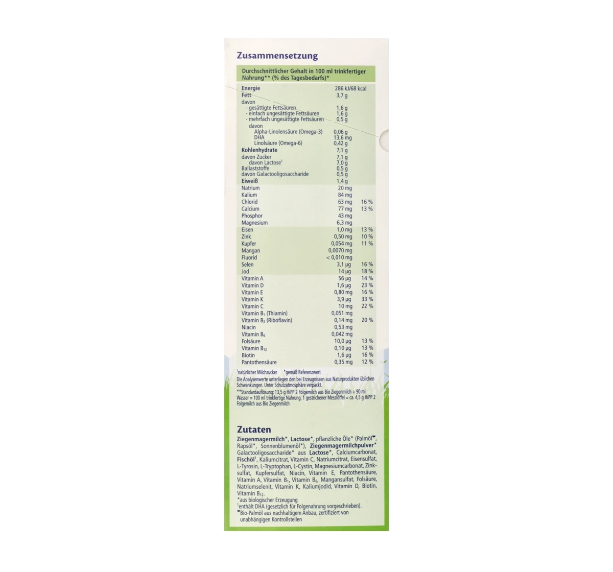 Ingredients: Entrahmte Ziegenmilch*, Laktose*, Pflanzenöle* (Palmöl*, Rapsöl*, Sonnenblumenöl*), entrahmte Ziegenmilch* in Pulverform, Galaktooligosaccharide* aus Laktose*, Calciumcarbonat, Fischöl**, Kaliumcitrat, Vitamin C, Natriumcitrat, Eisen(II)-sulfat, L-Tyrosin, L-Tryptophan, L-Cystin, Magnesiumcarbonat, Zinksulfat, Kupfersulfat, Niacin, Vitamin E, Pantothensäure, Vitamin A, Vitamin B1, Vitamin B6, Mangansulfat, Folinsäure, Natriumselenat, Vitamin K, Kaliumjodid, Vitamin D, Biotin, Vitamin B12
