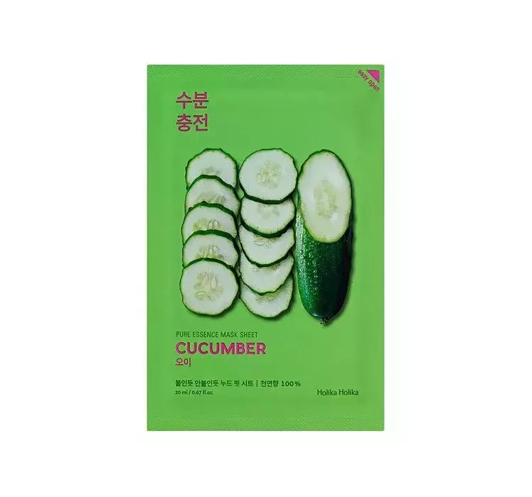 Holika Holika Pure Essence Mask Sheet Cucumber ist Gesichtsmaske auf einem Baumwollentuch mit Gurkenextrakt, der erfrischend und lindernd wirkt. Die Gurke verfügt über revitalisierende Eigenschaften, entspannt die Haut und verringert Gesichtsanschwellung. Enthält viele Vitamine und Mineralstoffen, deswegen spendet intensiv Feuchtigkeit und reduziert Falten. Die Maske reinigt, tonisiert und erhellt den Teint.