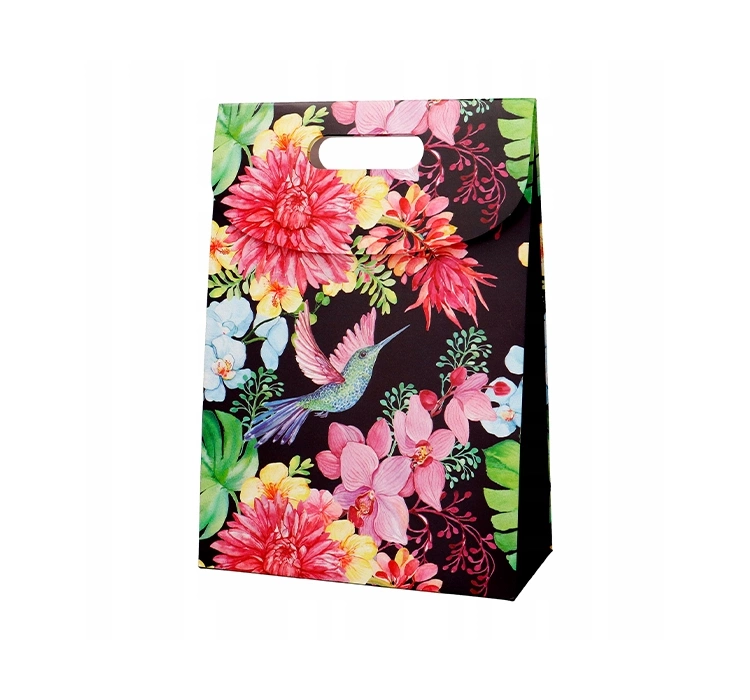 Incood Mittlere Geschenktasche schwarz mit bunten Pflanzen und Vögeln