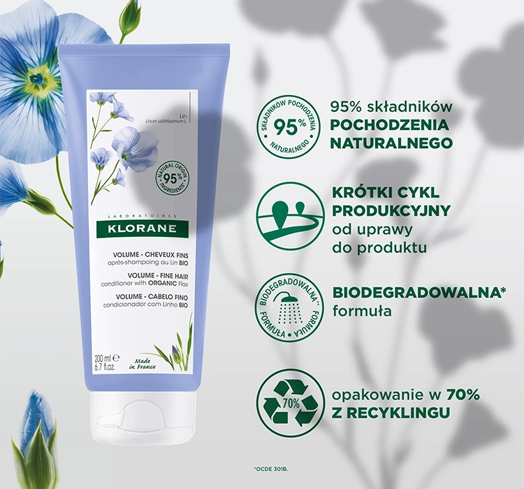 Der Conditioner mit Bio-Leinsamen ist der beste Weg, feines Haar zu verdicken und Probleme beim Styling zu lösen. Für optimale Ergebnisse sollte der Conditioner zusammen mit anderen Produkten der Klorane Volumen Linie verwendet werden. Ein weiterer Vorteil des Conditioners ist seine biologisch abbaubare Formel und die Tatsache, dass die Tube aus recycelten Materialien hergestellt wurde.