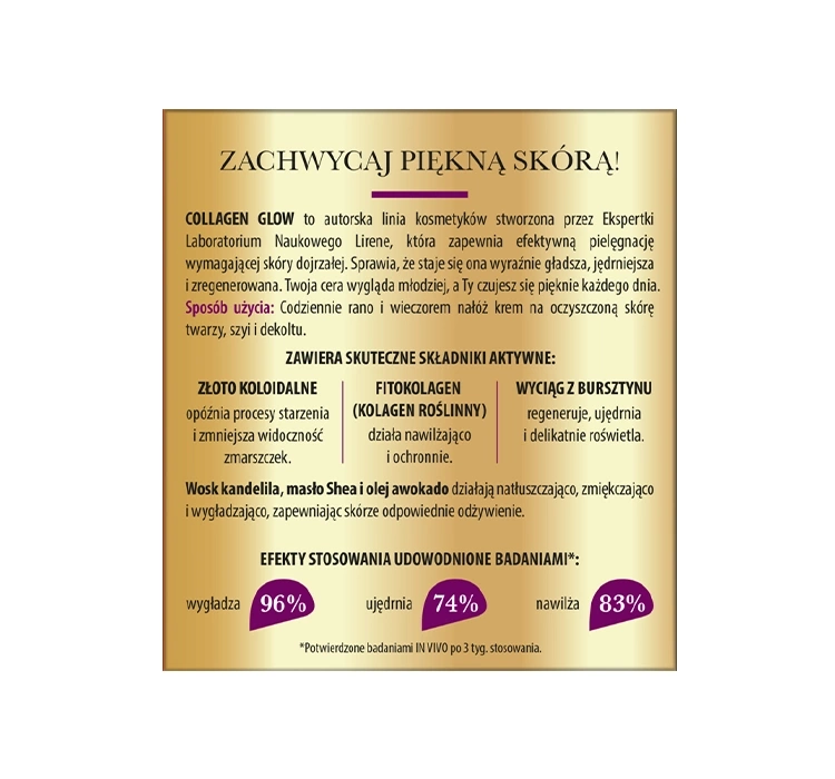 Das Produkt hat eine reine Formel, die zu 96% aus natürlichen Inhaltsstoffen besteht. Es ist vollständig vegan und tierversuchsfrei. Das Produkt ist dermatologisch getestet. Überprüfe unbedingt die gesamte Kollektion Lirene Collagen Glow. Entdecke intensiv verjüngende Pflege.