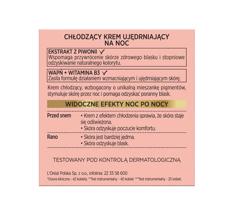 Die Formel der Nachtcreme L’Oréal Paris Age Perfect Golden Age mit Pfingstrosenextrakt unterstützt die Wiederherstellung des natürlichen Hauttons und eines gesunden Glows. Kalzium stärkt die Hautbarriere, verbessert die Hautdichte und -elastizität. Vitamin B3 (Niacinamid) glättet den Teint, gleicht Hautverfärbungen aus und wirkt gleichzeitig gegen Falten. Eine einzigartige Pigmentmischung bringt die Haut von innen heraus zum Strahlen und sorgt dafür, dass sie morgens erholter und lebendiger aussieht.