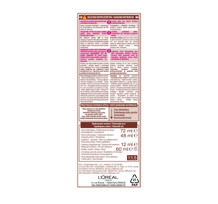 Maske (60 ml): AQUA / WATER • CETEARYL ALCOHOL • PROPYLENE GLYCOL • DECETH‑3 • LAURETH‑12 • ETHANOLAMINE • OLETH‑30 • LAURIC ACID • POLYQUATERNIUM‑6 • GLYCOL DISTEARATE • SODIUM METASILICATE • SILICA DIMETHYL SILYLATE [NANO] • CI 77491 • CI 77891 • p-AMINOPHENOL • 2-AMINO-3-HYDROXYPYRIDINE • m-AMINOPHENOL • ASCORBIC ACID • MICA • SODIUM METABISULFITE • HYDROXYBENZOMORPHOLINE • 6-HYDROXYINDOLE • THIOGLYCERIN • TOLUENE‑2,5-DIAMINE • 2-METHYL-5-HYDROXYETHYLAMINOPHENOL • CARBOMER • EDTA • TETRASODIUM EDTA • PARFUM / FRAGRANCE (F.I.L. Z70039430/1).