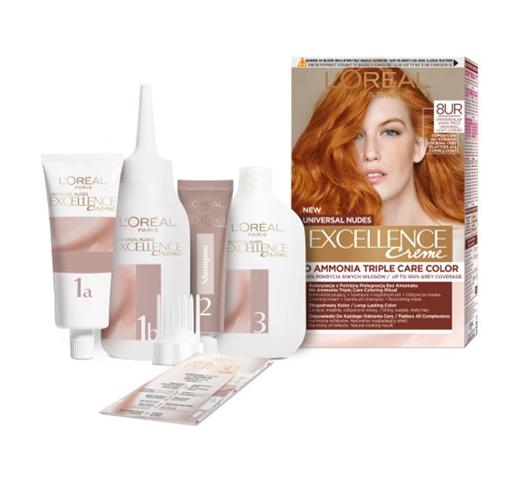 Dauerhafte Haarfarbe L'Oréal Paris Excellence Crème Universal Nudes bietet Ihnen einen exklusiven Colorationsritual mit dreifacher Pflegewirkung und innovativer Formel ohne Ammoniak. Sie sorgt für intensive, natürlich wirkende Farbe und gleichzeitig für den Schutz und die Gesundheit Ihrer Haare.