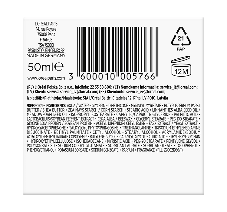 Ingredients: AQUA / WATER • GLYCERIN • DIMETHICONE • MYRISTYL MYRISTATE • BUTYROSPERMUM PARKII BUTTER / SHEA BUTTER • ZEA MAYS STARCH / CORN STARCH • STEARIC ACID • LIMNANTHES ALBA SEED OIL / MEADOWFOAM SEED OIL • ISOPROPYL ISOSTEARATE • CAPRYLIC/CAPRIC TRIGLYCERIDE • PALMITIC ACID • LACTOBACILLUS/SOYBEAN FERMENT EXTRACT • CERA ALBA / BEESWAX • GLYCERYL STEARATE • PEG-100 STEARATE • GLYCINE SOJA PROTEIN / SOYBEAN PROTEIN • ACETYL DIPEPTIDE-1 CETYL ESTER • FAEX EXTRACT / YEAST EXTRACT • HYDROXYACETOPHENONE • SALICYLOYL PHYTOSPHINGOSINE • TRIETHANOLAMINE • TRISODIUM ETHYLENEDIAMINE DISUCCINATE • RETINYL PALMITATE • CETYL ALCOHOL • STEARYL ALCOHOL • ACRYLAMIDE/SODIUM ACRYLOYLDIMETHYLTAURATE COPOLYMER • BUTYLENE GLYCOL • CAPRYLYL GLYCOL • CITRIC ACID • ETHYLHEXYLGLYCERIN • HYDROXYETHYLCELLULOSE • ISOHEXADECANE • MYRISTIC ACID • PEG-20 STEARATE • PENTYLENE GLYCOL • POLYSORBATE 80 • SODIUM COCOYL GLUTAMATE • SORBITAN LAURATE • SORBITAN OLEATE • TOCOPHEROL • PHENOXYETHANOL • POTASSIUM SORBATE • SODIUM BENZOATE • PARFUM / FRAGRANCE (F.I.L. Z70021956/1).